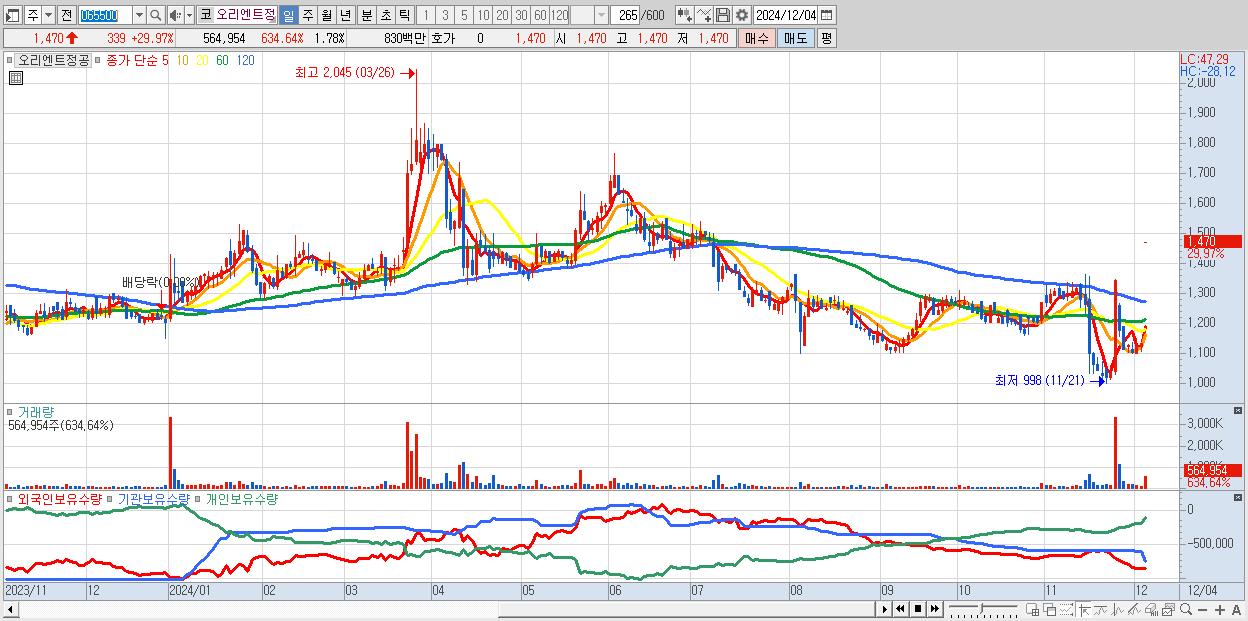 - 오리엔트정공 (1,470원 ▲ 29.97% , 시총: 467억, 거래량: 564,954, 거래대금:8억)