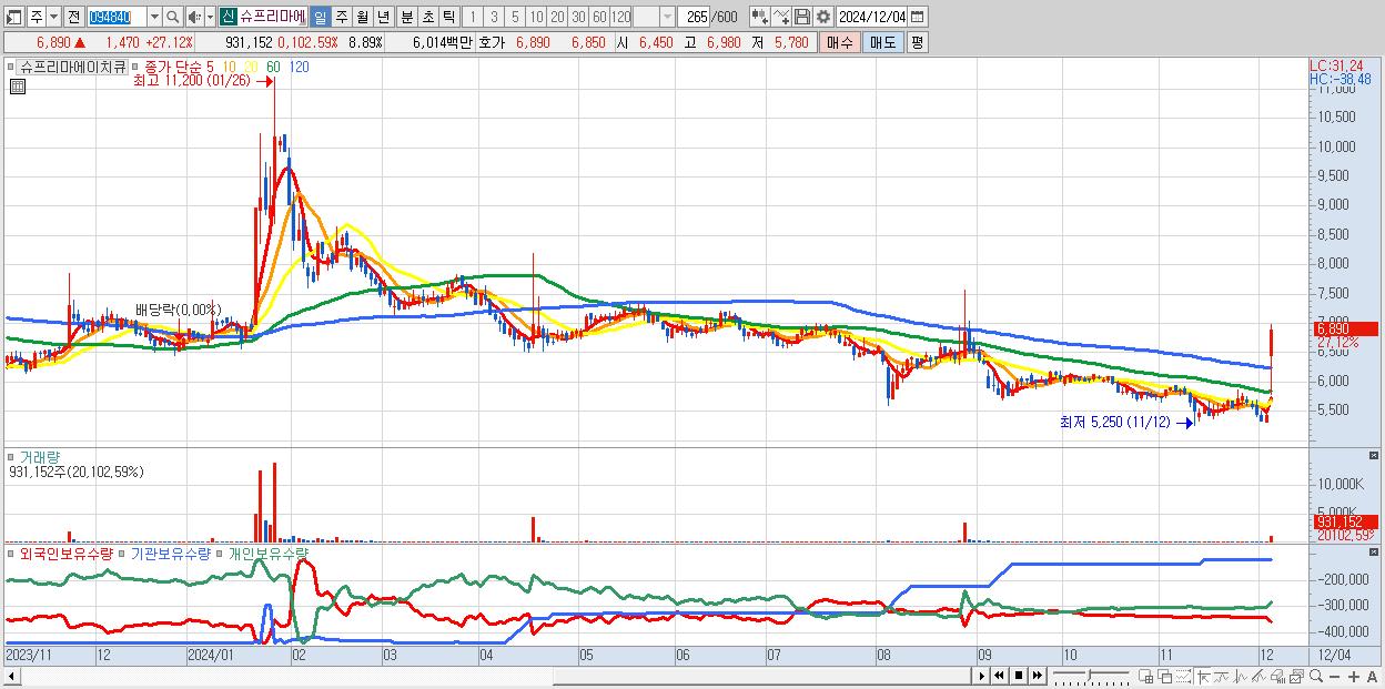 - 슈프리마에이치큐 (6,890원 ▲ 27.12% , 시총: 722억, 거래량: 931,152, 거래대금:60억)