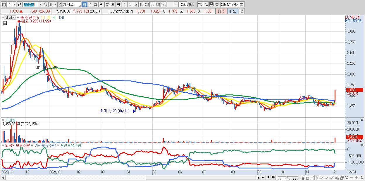 - 체시스 (1,630원 ▲ 26.36% , 시총: 522억, 거래량: 7,458,881, 거래대금:114억)
