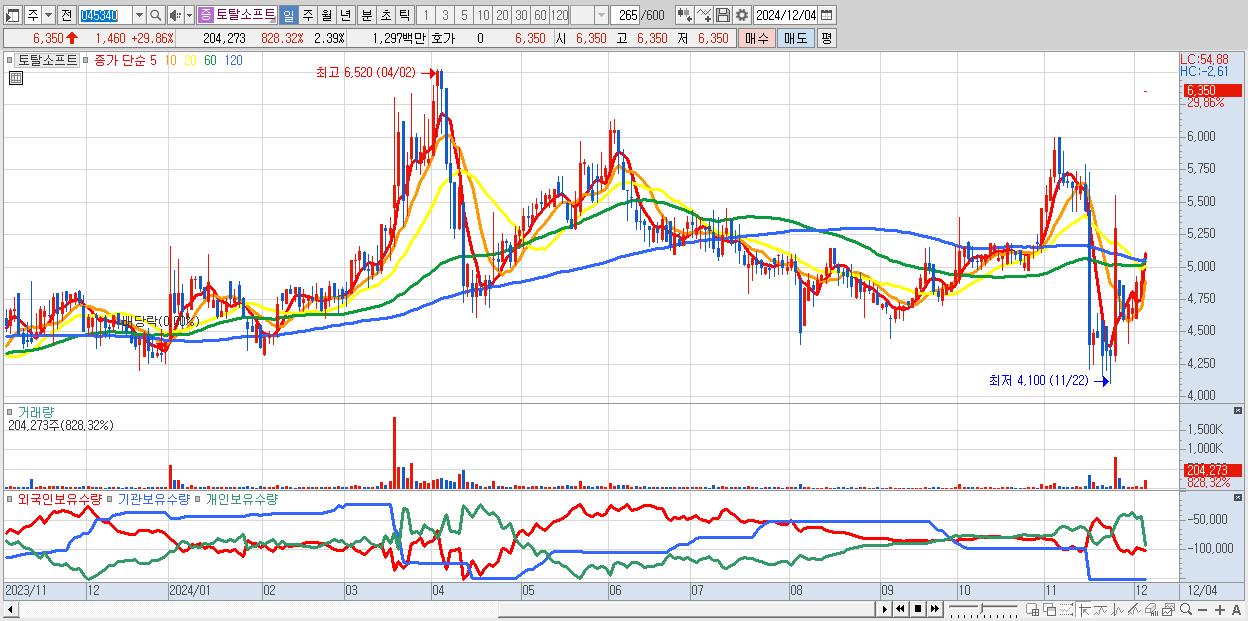 - 토탈소프트 (6,350원 ▲ 29.86% , 시총: 543억, 거래량: 204,273, 거래대금:13억)
