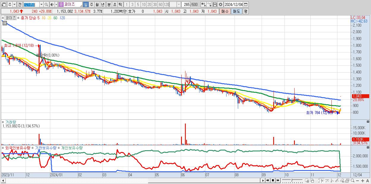 - 코이즈 (1,043원 ▲ 29.89% , 시총: 319억, 거래량: 1,153,082, 거래대금:12억)