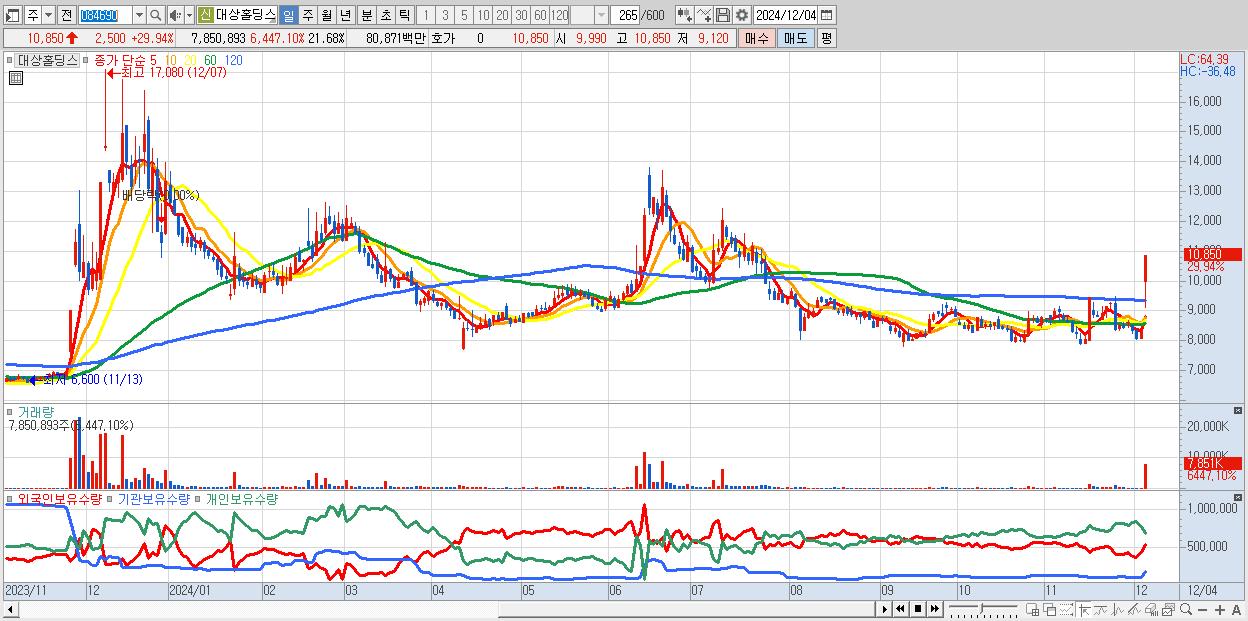 - 대상홀딩스 (10,850원 ▲ 29.94% , 시총: 3,929억, 거래량: 7,850,893, 거래대금:809억)