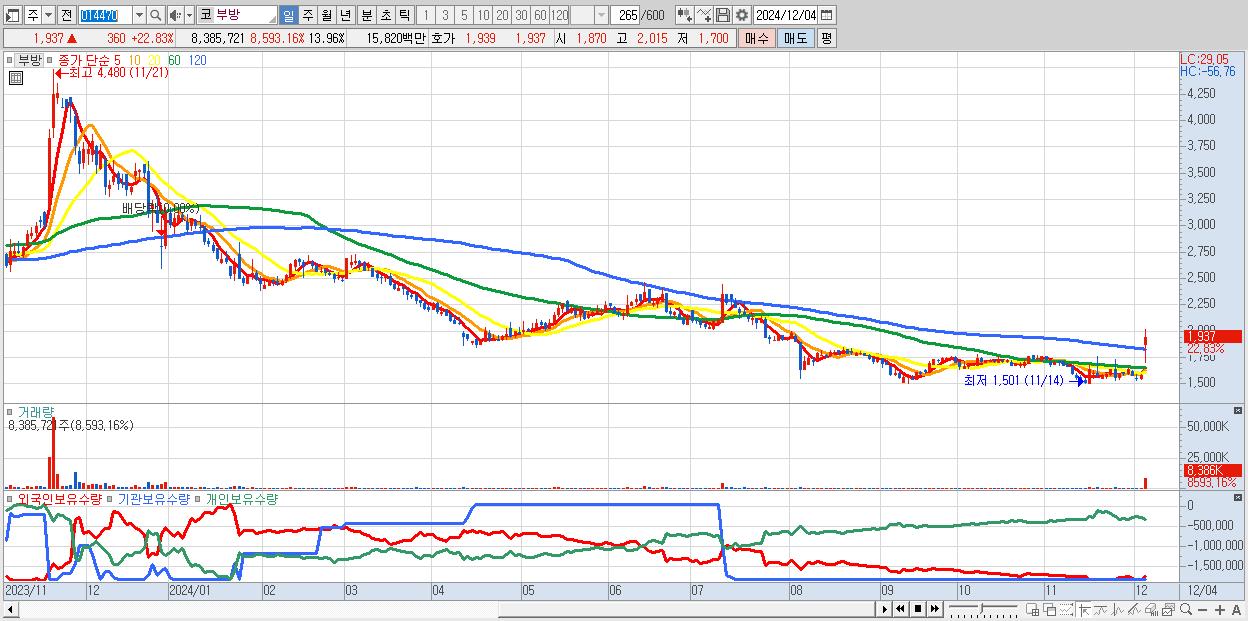 - 부방 (1,937원 ▲ 22.83% , 시총: 1,163억, 거래량: 8,385,721, 거래대금:158억)