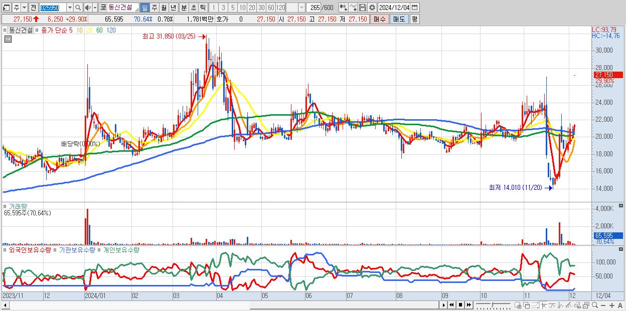 - 동신건설 (27,150원 ▲ 29.9% , 시총: 2,281억, 거래량: 65,595, 거래대금:18억)