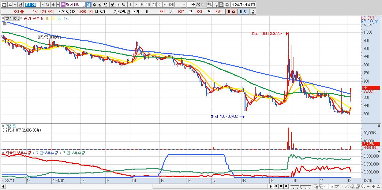 - 형지I&C (661원 ▲ 29.86% , 시총: 169억, 거래량: 3,715,418, 거래대금:24억)