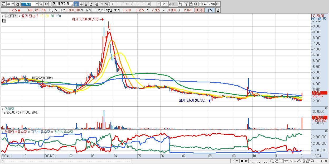 - 화천기계 (3,225원 ▲ 25.73% , 시총: 710억, 거래량: 19,950,057, 거래대금:623억)