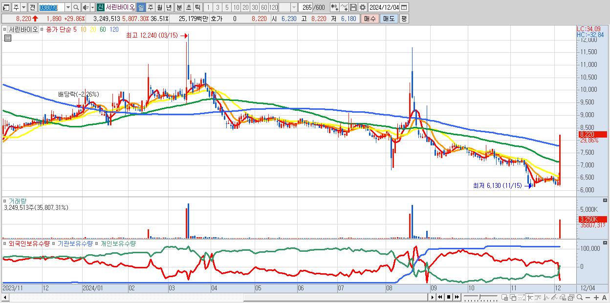 - 서린바이오 (8,220원 ▲ 29.86% , 시총: 732억, 거래량: 3,249,513, 거래대금:252억)