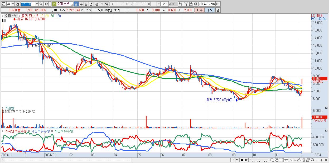 - 오파스넷 (8,650원 ▲ 29.88% , 시총: 1,129억, 거래량: 3,103,475, 거래대금:259억)