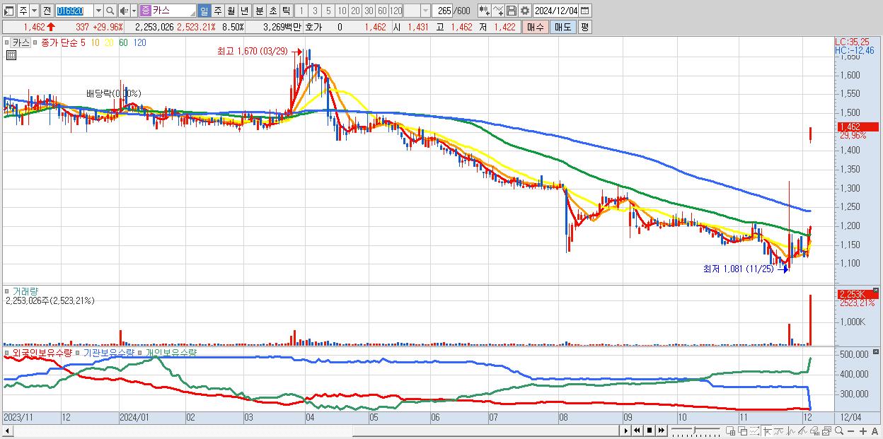 - 카스 (1,462원 ▲ 29.96% , 시총: 387억, 거래량: 2,253,026, 거래대금:33억)