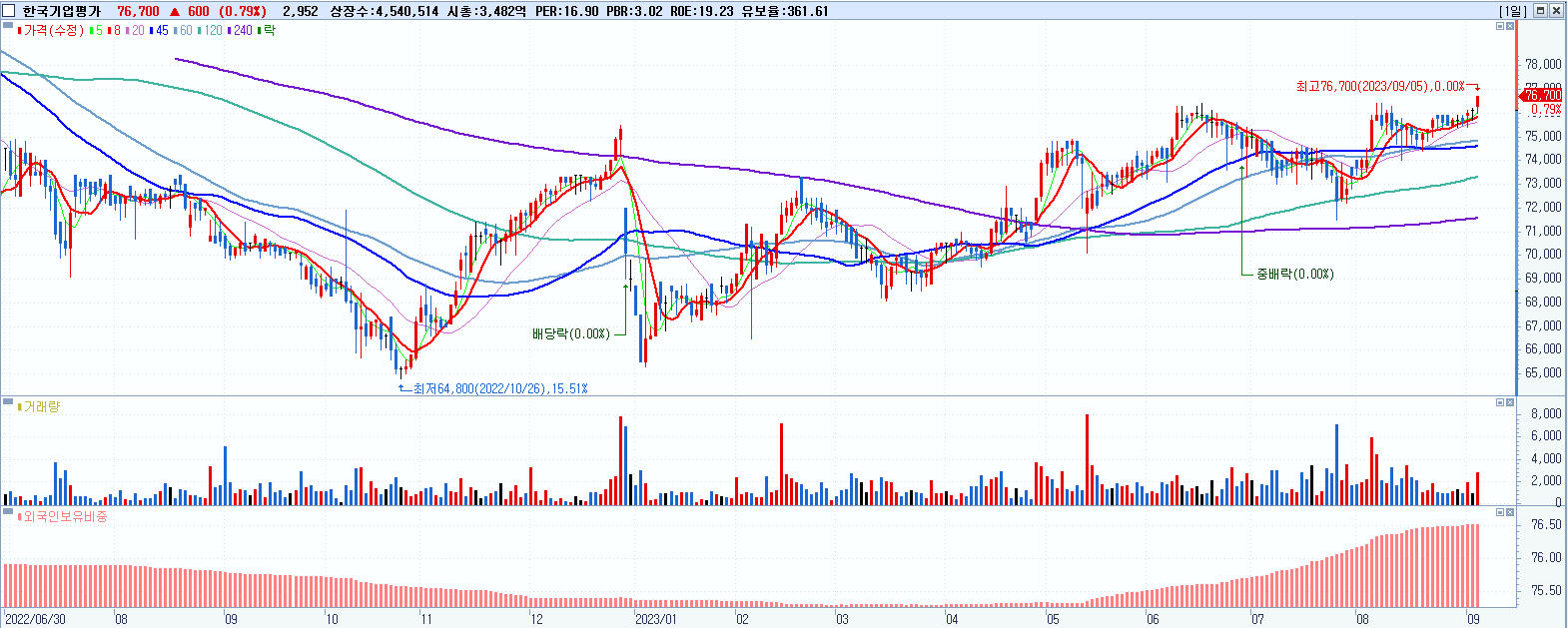 - 한국기업평가 (76,700원 ▲ 0.79% , 시총: 3,483억, 거래량: 2,957, 거래대금:2억, KOSDAQ)