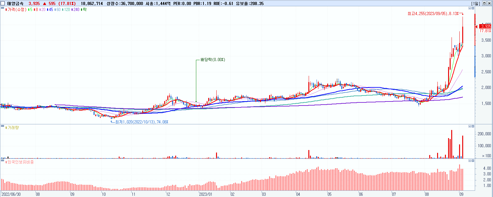 태양금속 3,935원 ▲ 17.81% (KOSPI, 004100)