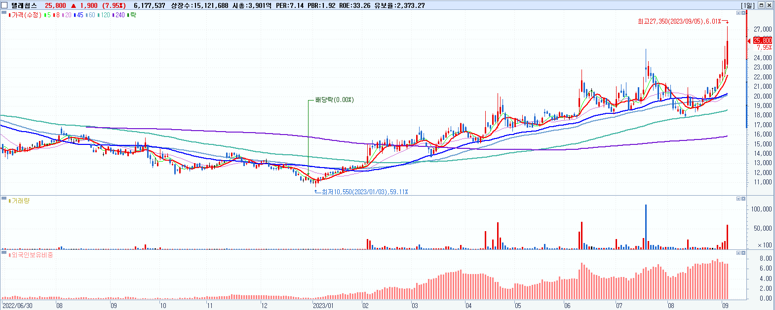 - 텔레칩스 (25,800원 ▲ 7.95% , 시총: 3,901억, 거래량: 6,183,893, 거래대금:1,575억, KOSDAQ)