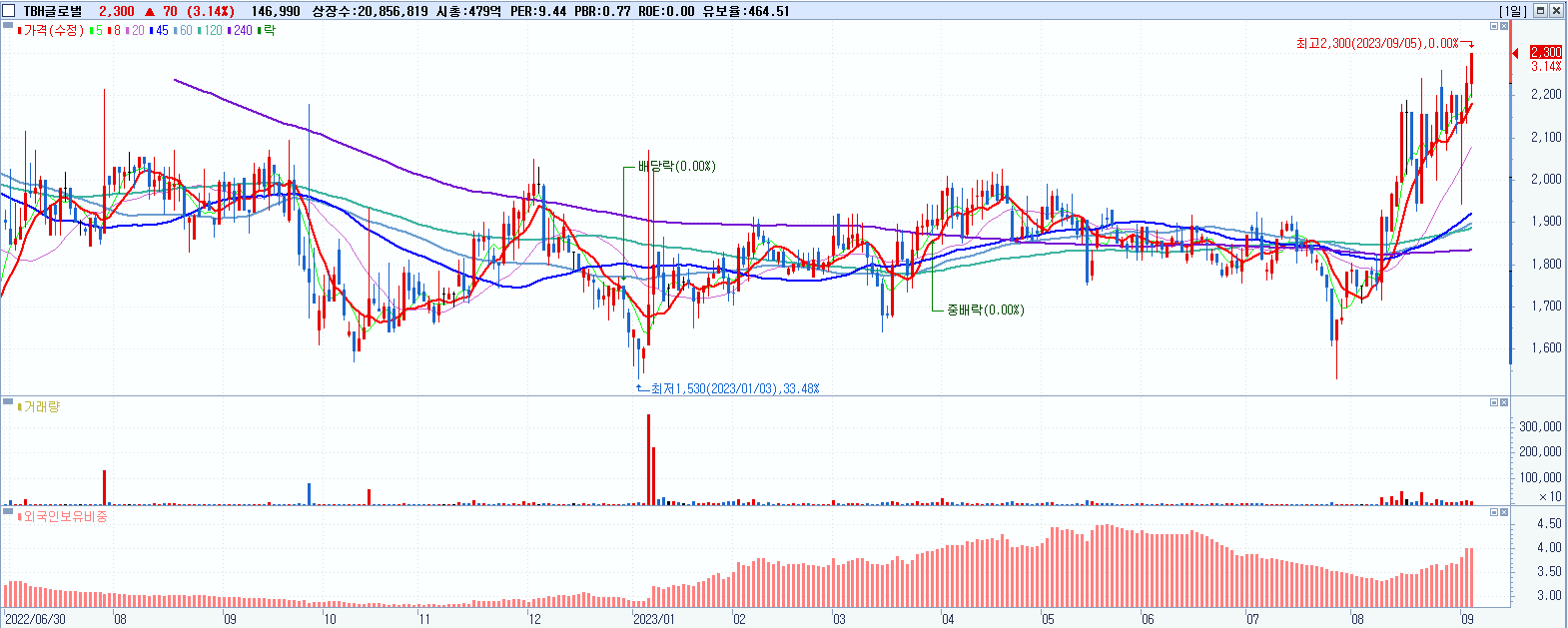 TBH글로벌 2,300원 ▲ 3.14% (KOSPI, 084870)