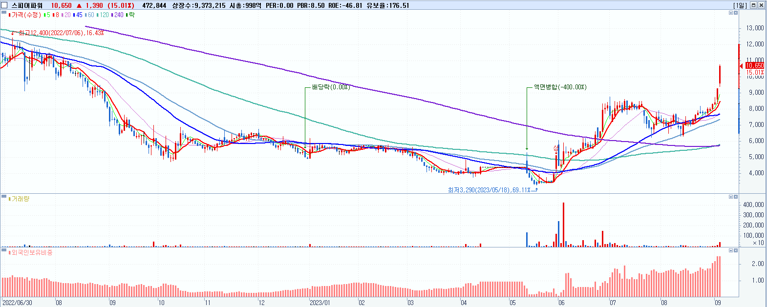 - 스피어파워 (10,650원 ▲ 15.01% , 시총: 998억, 거래량: 473,257, 거래대금:48억, KOSDAQ)