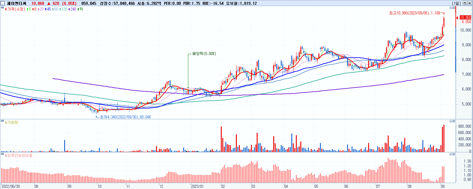 - 제이앤티씨 (10,860원 ▲ 6.05% , 시총: 6,282억, 거래량: 859,090, 거래대금:92억, KOSDAQ)