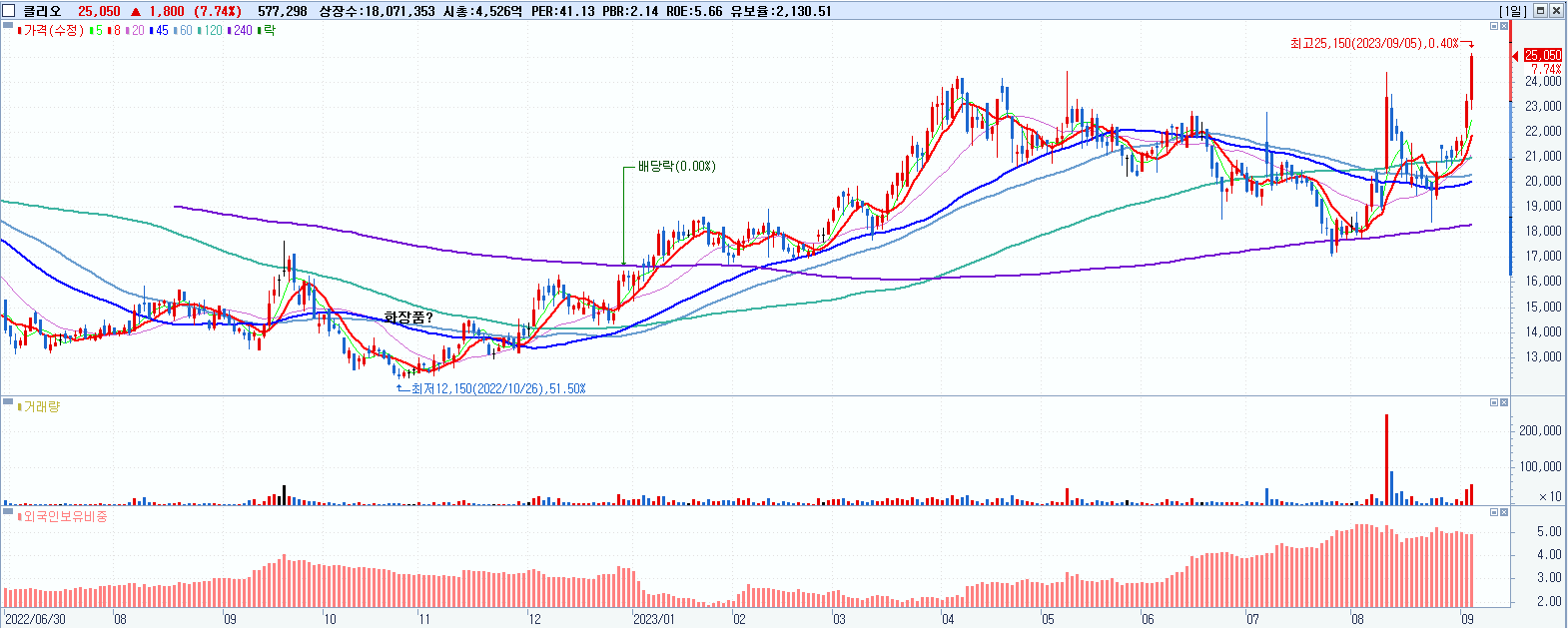 - 클리오 (25,050원 ▲ 7.74% , 시총: 4,527억, 거래량: 578,327, 거래대금:140억, KOSDAQ)