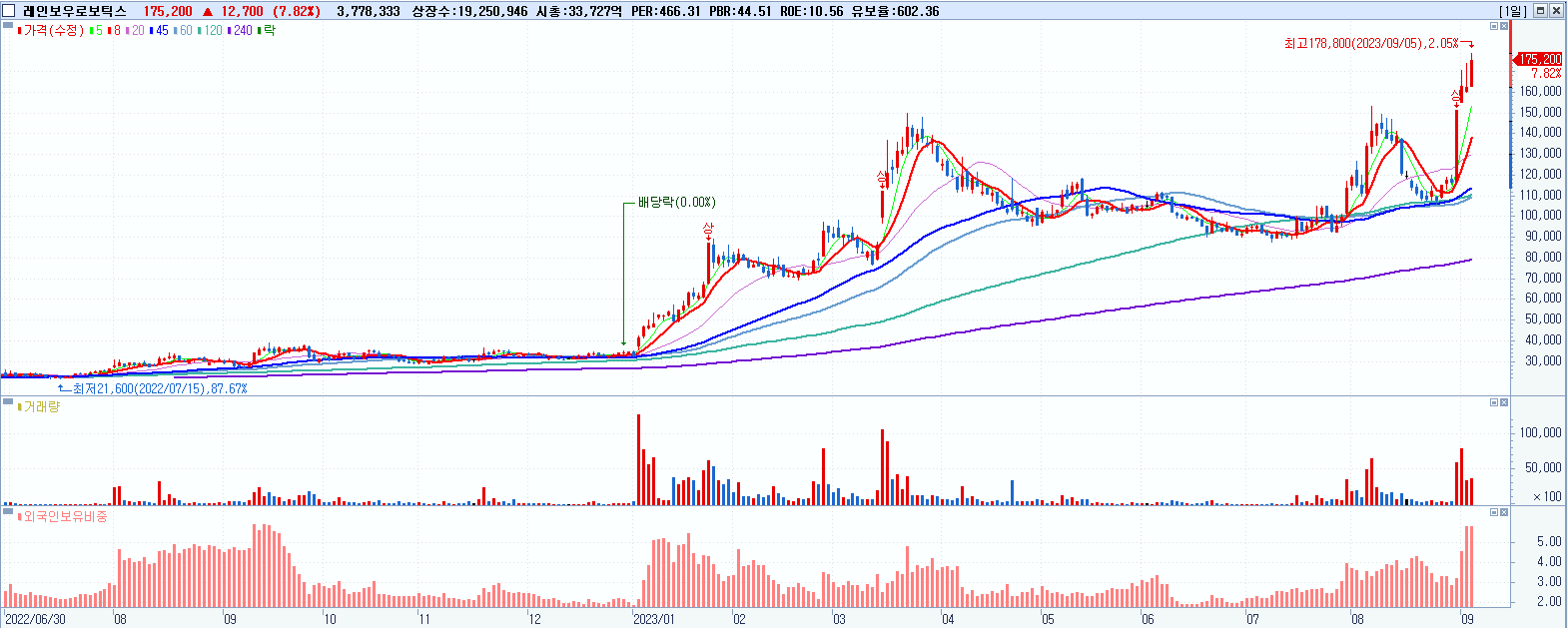- 레인보우로보틱스 (175,200원 ▲ 7.82% , 시총: 33,728억, 거래량: 3,784,062, 거래대금:6,495억, KOSDAQ)