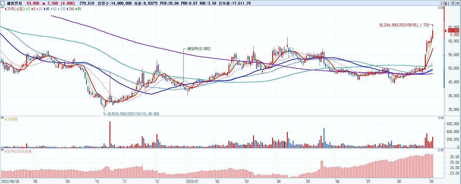 세방전지 63,800원 ▲ 4.08% (KOSPI, 004490)