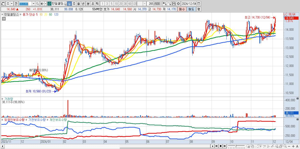 한일홀딩스 14,640원 ▲ 1.81% (KOSPI, 003300)
