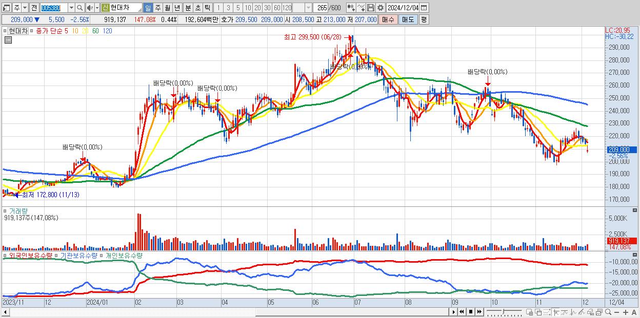- 현대차 (209,000원 ▼ -2.56% , 시총: 437,680억, 거래량: 919,137, 거래대금:1,926억)