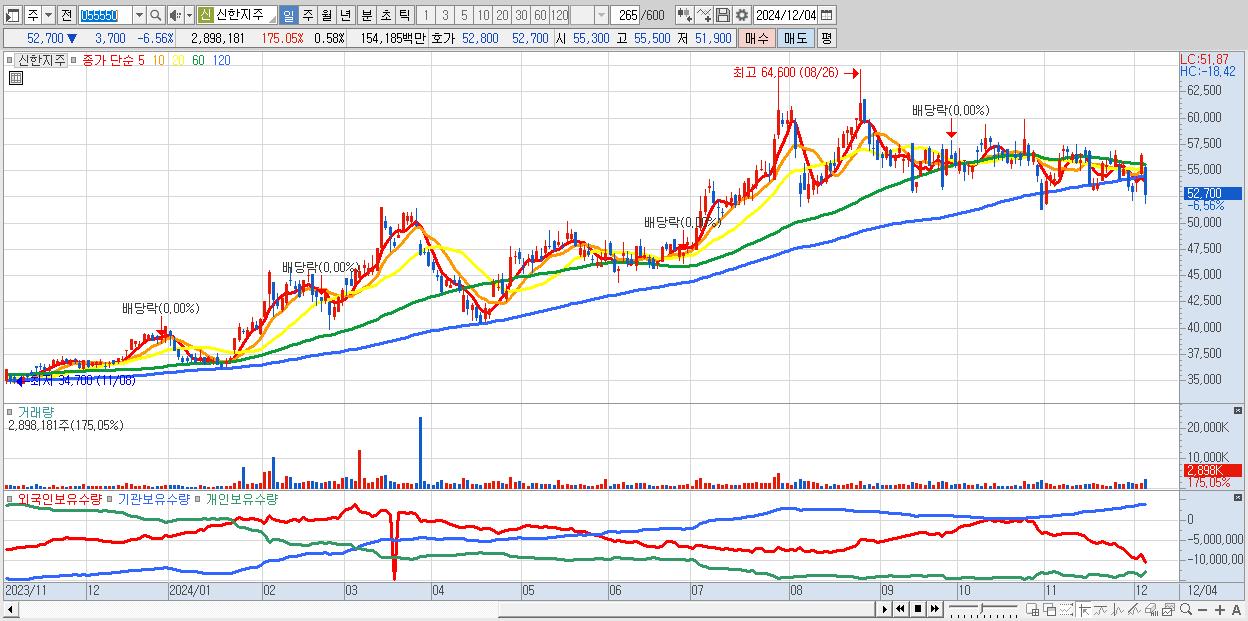 - 신한지주 (52,700원 ▼ -6.56% , 시총: 265,316억, 거래량: 2,898,181, 거래대금:1,542억)