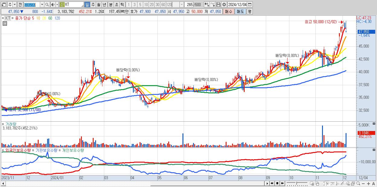 - KT (47,850원 ▼ -1.64% , 시총: 120,592억, 거래량: 3,183,782, 거래대금:1,575억)