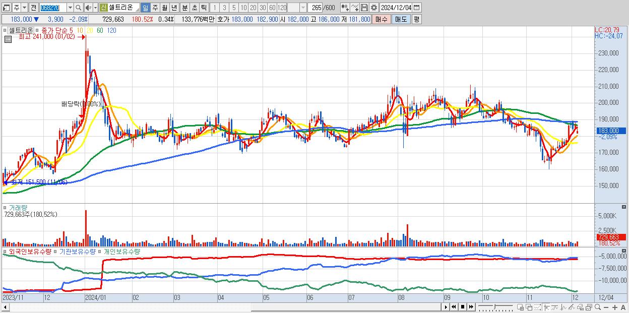 - 셀트리온 (183,000원 ▼ -2.09% , 시총: 397,254억, 거래량: 729,663, 거래대금:1,338억)