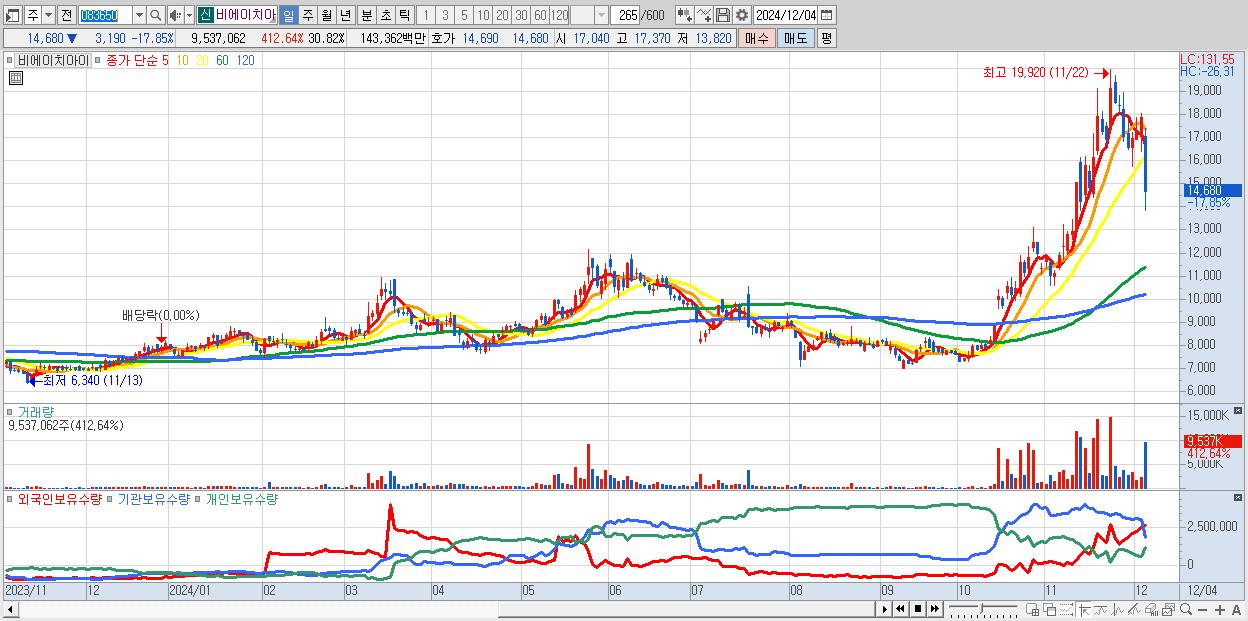 - 비에이치아이 (14,680원 ▼ -17.85% , 시총: 4,543억, 거래량: 9,537,062, 거래대금:1,434억)