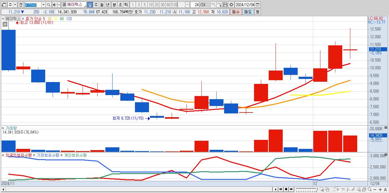 - 에이럭스 (11,210원 ▼ -2.18% , 시총: 1,497억, 거래량: 14,341,939, 거래대금:1,668억)