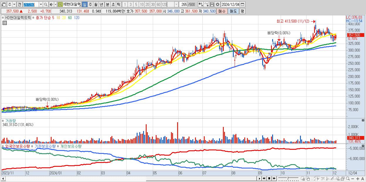 - HD현대일렉트릭 (357,500원 ▲ 0.7% , 시총: 128,869억, 거래량: 340,313, 거래대금:1,199억)