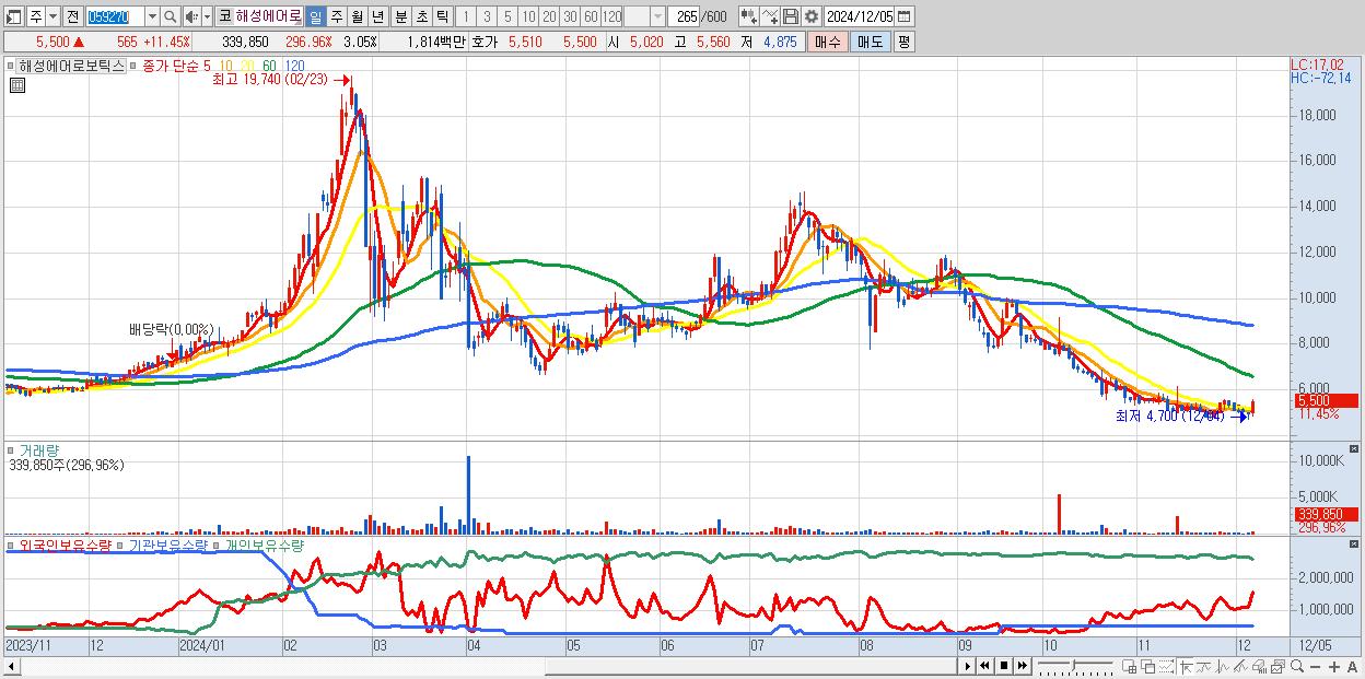 - 해성에어로보틱스 (5,500원 ▲ 11.45% , 시총: 613억, 거래량: 339,850, 거래대금:18억)