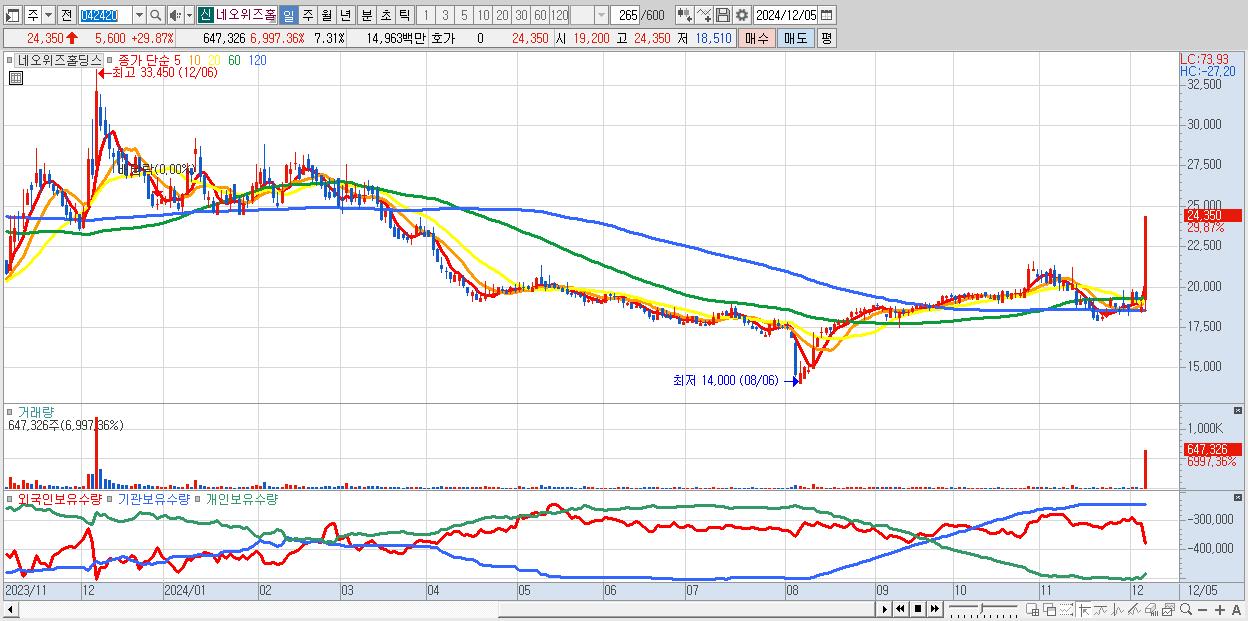 - 네오위즈홀딩스 (24,350원 ▲ 29.87% , 시총: 2,157억, 거래량: 647,326, 거래대금:150억)