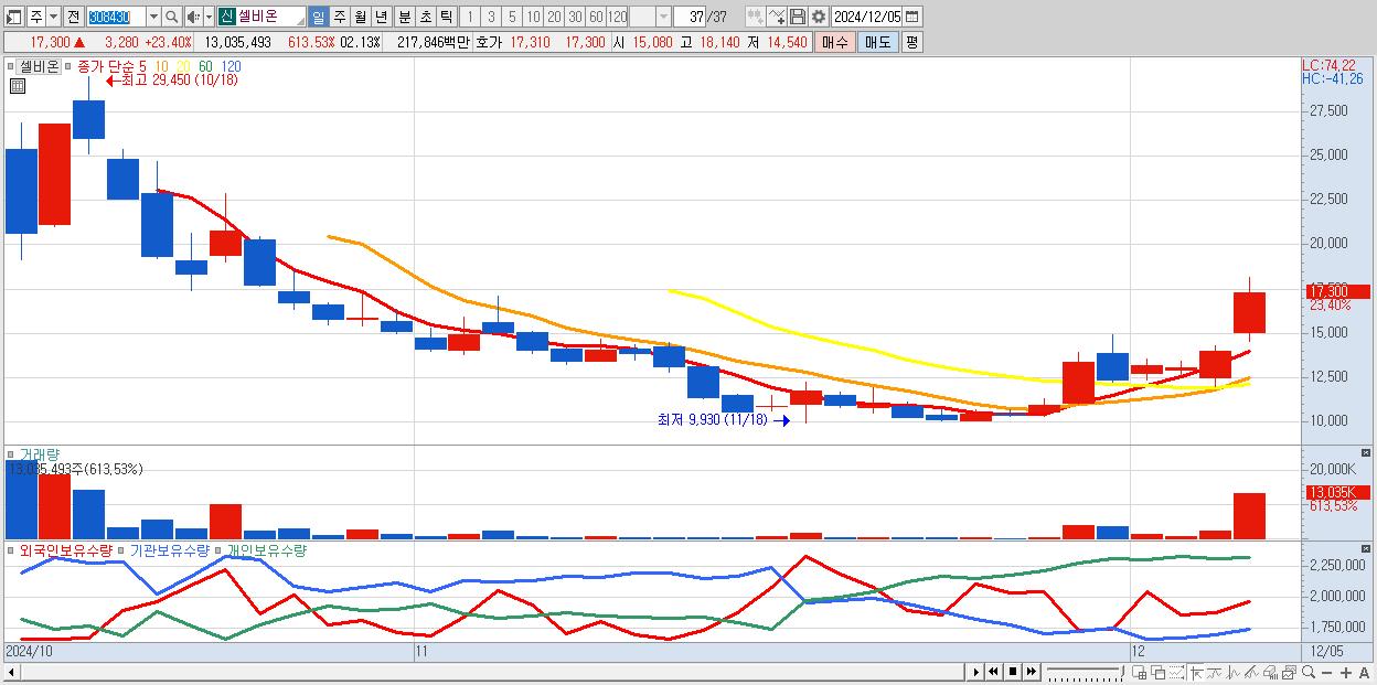 - 셀비온 (17,300원 ▲ 23.4% , 시총: 2,208억, 거래량: 13,035,493, 거래대금:2,178억)