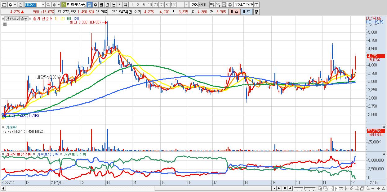 - 한화투자증권 (4,275원 ▲ 15.07% , 시총: 9,172억, 거래량: 57,277,653, 거래대금:2,399억)