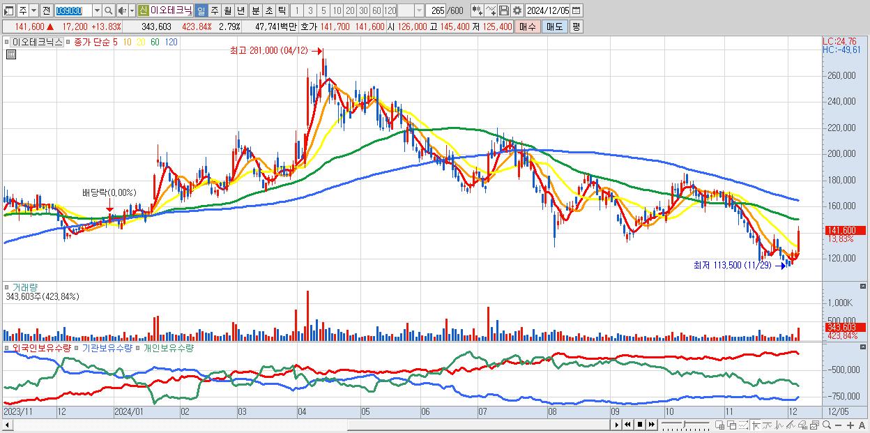 - 이오테크닉스 (141,600원 ▲ 13.83% , 시총: 17,444억, 거래량: 343,603, 거래대금:477억)