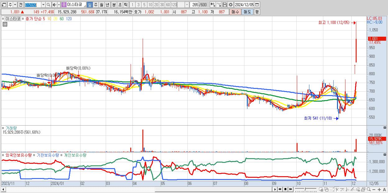 - 이스타코 (1,001원 ▲ 17.49% , 시총: 429억, 거래량: 15,929,288, 거래대금:162억)