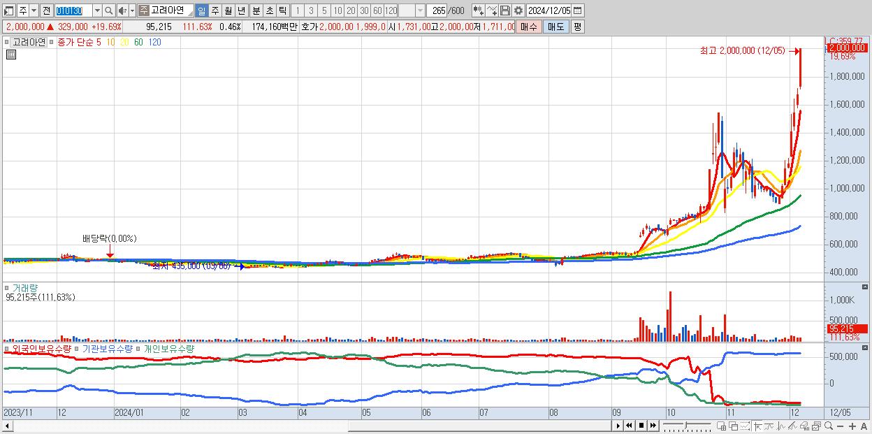- 고려아연 (2,000,000원 ▲ 19.69% , 시총: 414,066억, 거래량: 95,215, 거래대금:1,742억)