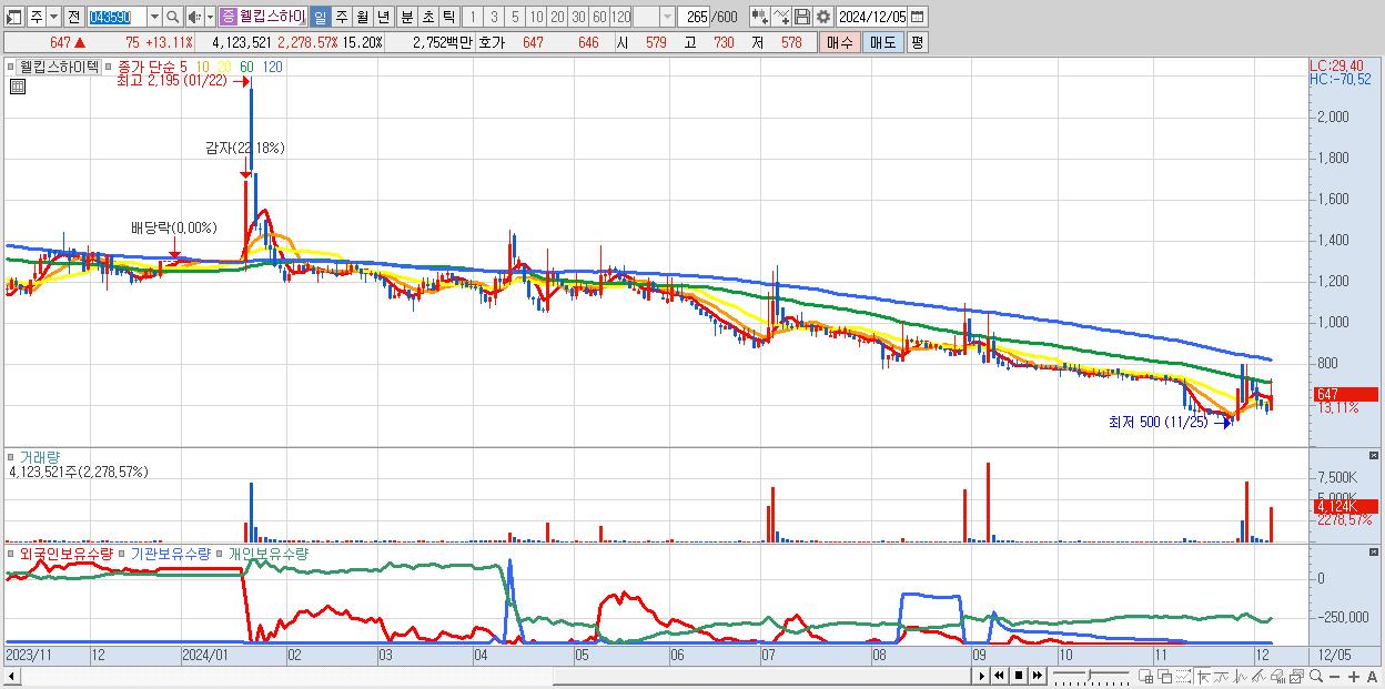 - 웰킵스하이텍 (647원 ▲ 13.11% , 시총: 176억, 거래량: 4,123,521, 거래대금:28억)