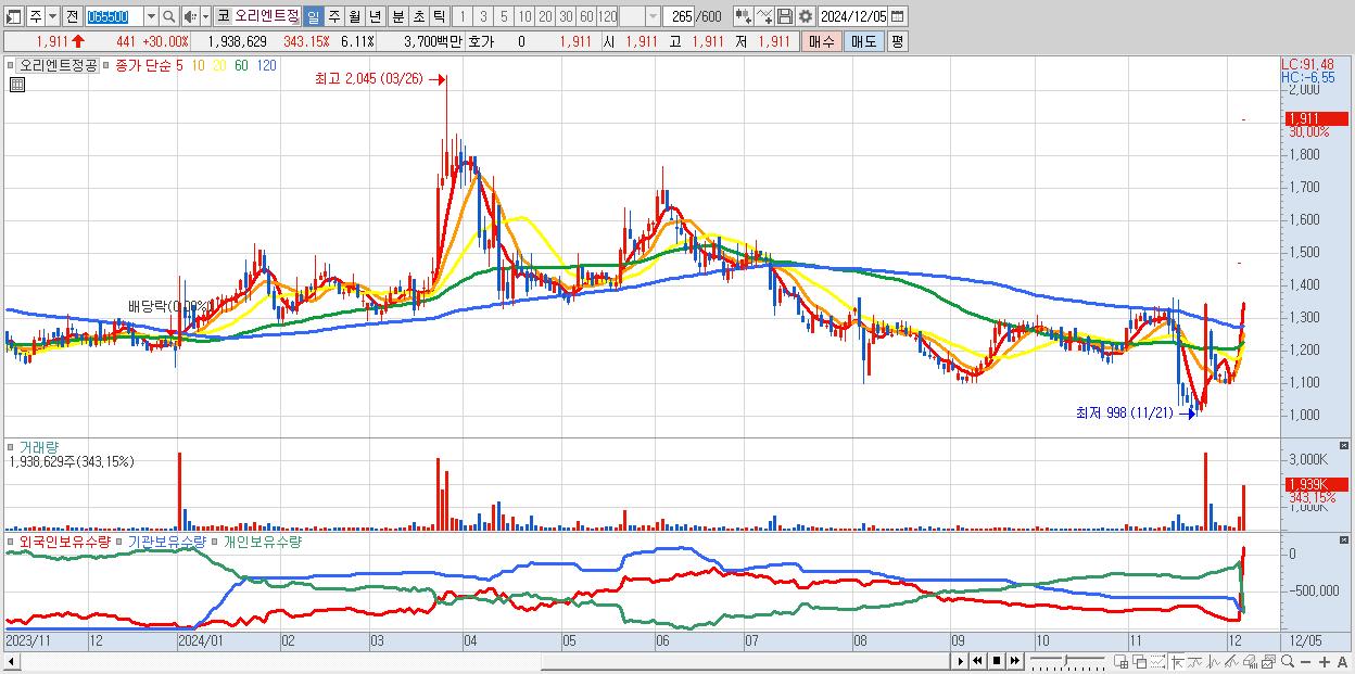 - 오리엔트정공 (1,911원 ▲ 30% , 시총: 607억, 거래량: 1,938,629, 거래대금:37억)