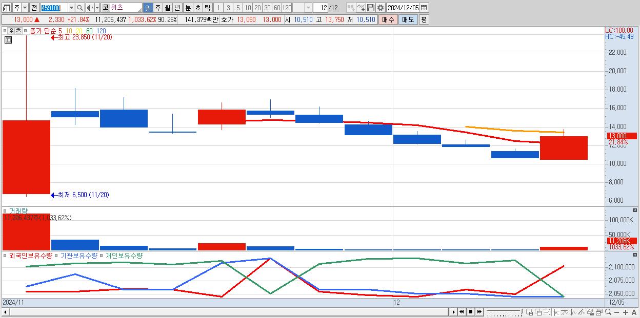 - 위츠 (13,000원 ▲ 21.84% , 시총: 1,614억, 거래량: 11,206,437, 거래대금:1,414억)