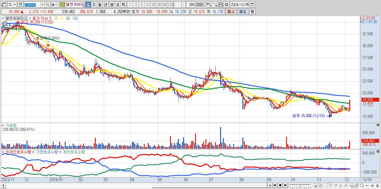 - 엘앤씨바이오 (18,590원 ▲ 13.49% , 시총: 4,217억, 거래량: 239,862, 거래대금:43억)