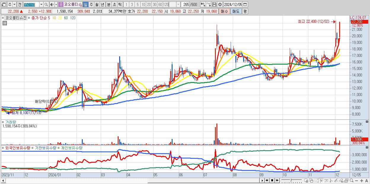 - 코오롱티슈진 (22,200원 ▲ 12.98% , 시총: 17,642억, 거래량: 1,598,154, 거래대금:344억)