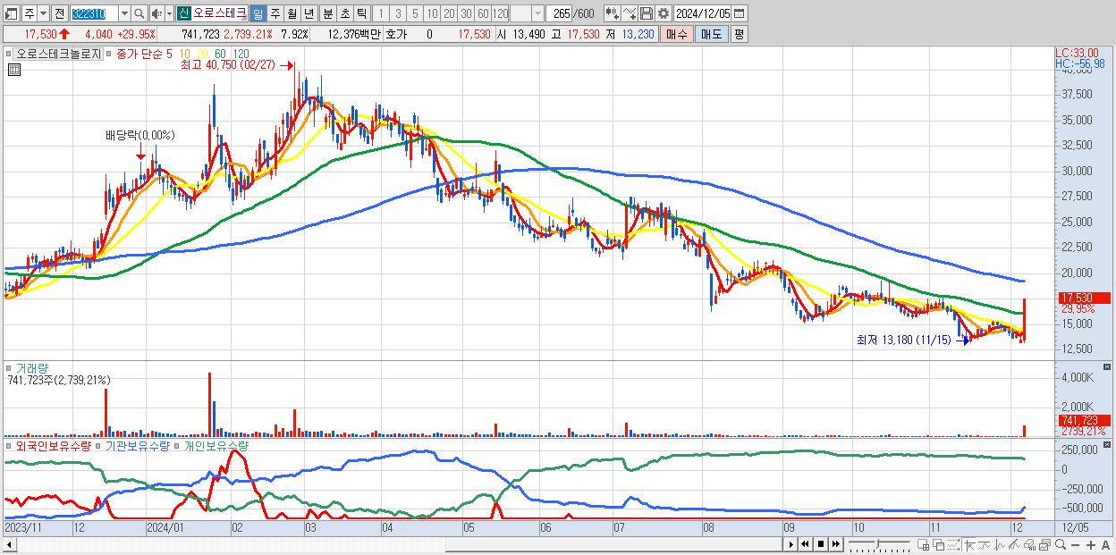 - 오로스테크놀로지 (17,530원 ▲ 29.95% , 시총: 1,642억, 거래량: 741,723, 거래대금:124억)