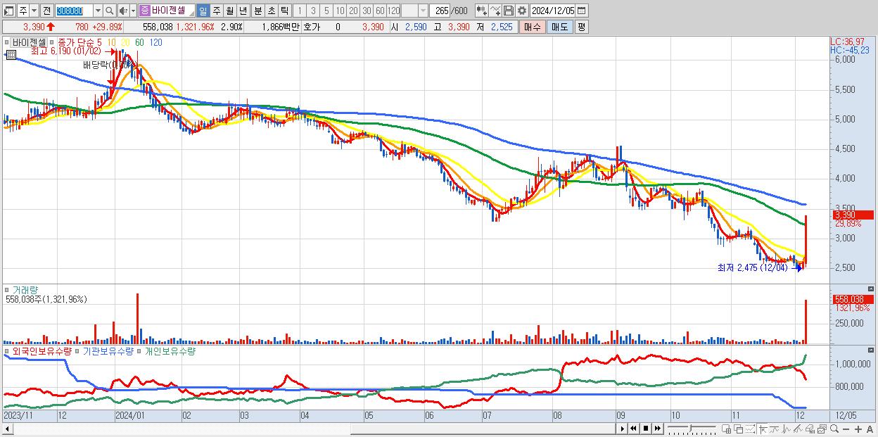 - 바이젠셀 (3,390원 ▲ 29.89% , 시총: 653억, 거래량: 558,038, 거래대금:19억)