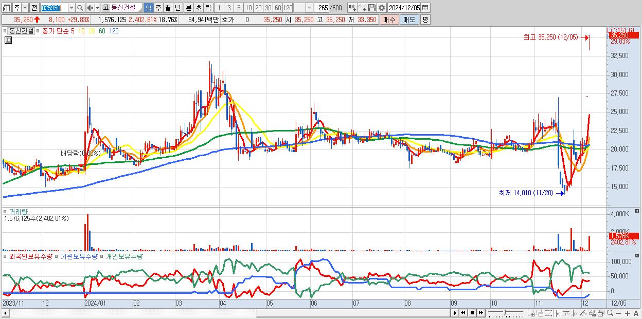 - 동신건설 (35,250원 ▲ 29.83% , 시총: 2,961억, 거래량: 1,576,125, 거래대금:549억)