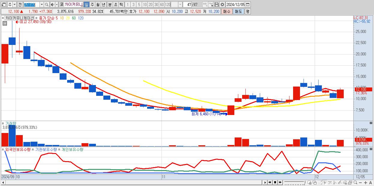 - 차이커뮤니케이션 (12,100원 ▲ 17.36% , 시총: 1,347억, 거래량: 3,875,616, 거래대금:457억)