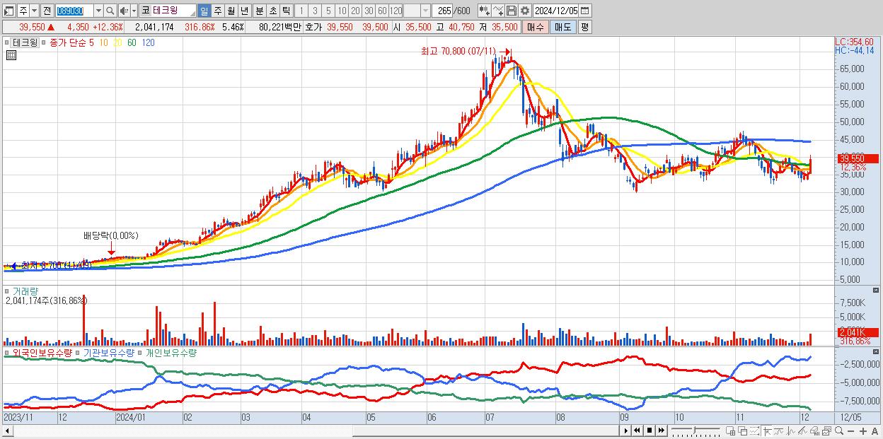 - 테크윙 (39,550원 ▲ 12.36% , 시총: 14,773억, 외국인 순매수 거래금:37억)