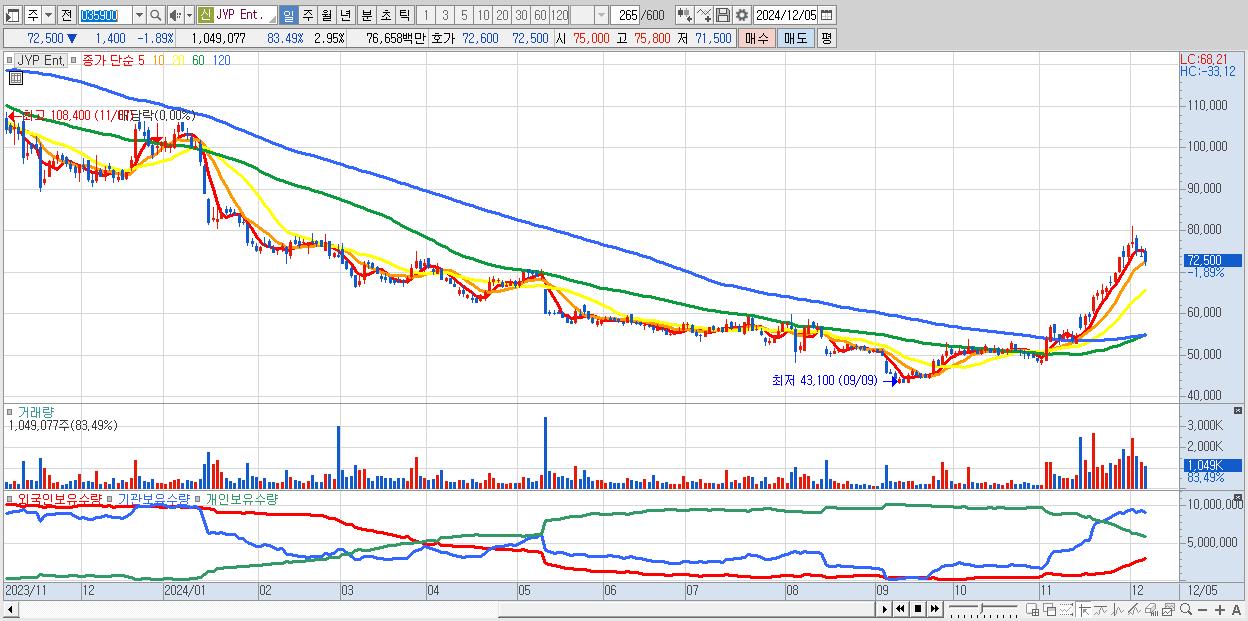 - JYP Ent. (72,500원 ▼ -1.89% , 시총: 25,761억, 외국인 순매수 거래금:155억)