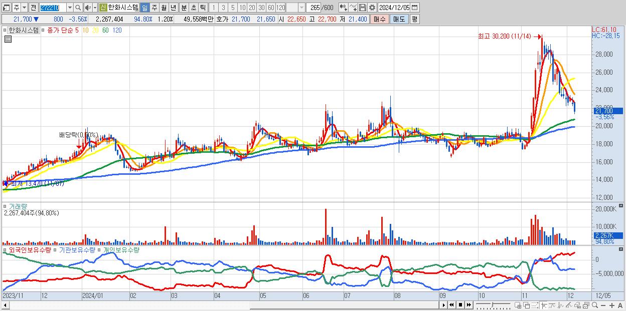 - 한화시스템 (21,700원 ▼ -3.56% , 시총: 40,996억, 외국인 순매수 거래금:65억)