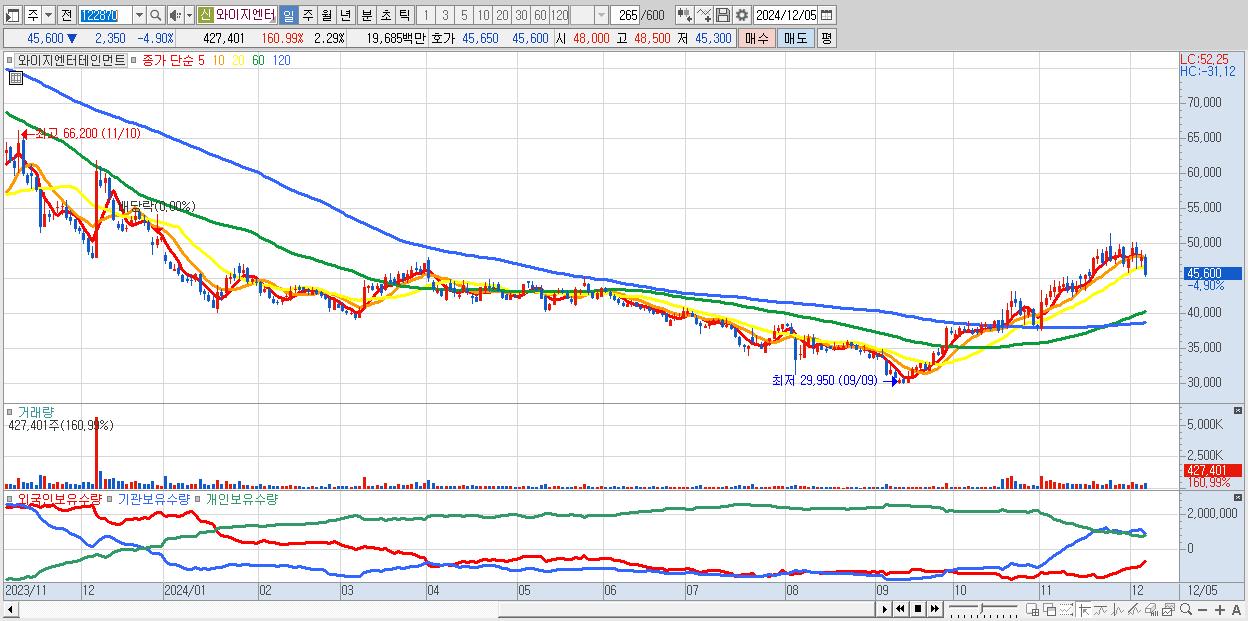 - 와이지엔터테인먼트 (45,600원 ▼ -4.9% , 시총: 8,523억, 외국인 순매수 거래금:49억)